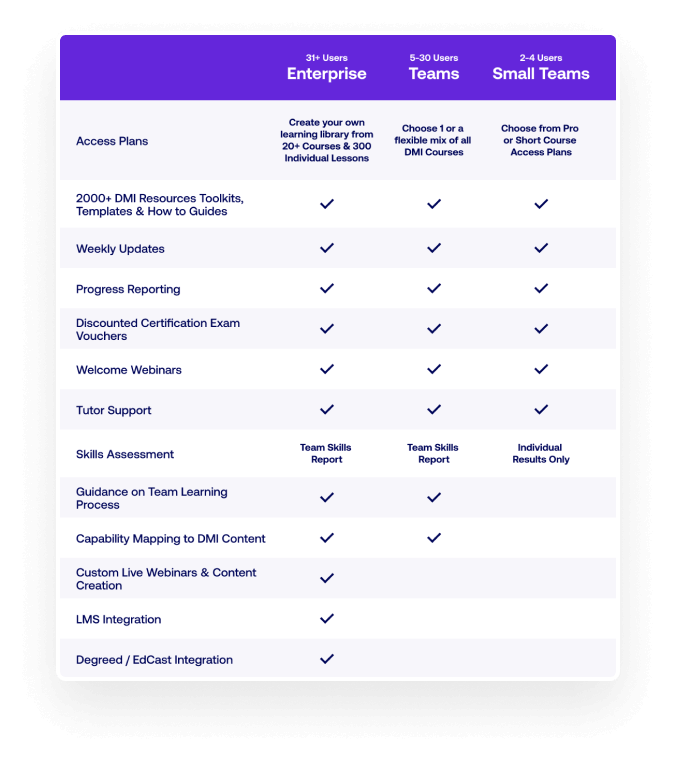 The Teams and Enterprise plans provide organisations with a DMI Business Membership Plan, including access to a broad catalogue of Courses, Learning Paths and more than 2000+ Resources. Enterprise Size Teams have access to; DMI's Skills Evaluation and Benchmarking Tool, greater flexibility of Course Library options, custom company-specific webinars and more.
